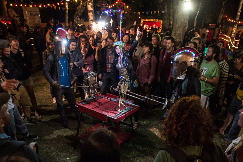 un spectacle issu des arts de la marionnette qui a habilement subtilisé son euphorie à la fête foraine et leur baratin aux bonimenteurs d’autrefois. Un spectacle où la rencontre entre attractions, public et comédiens crée une narration sans cesse renouvelée.